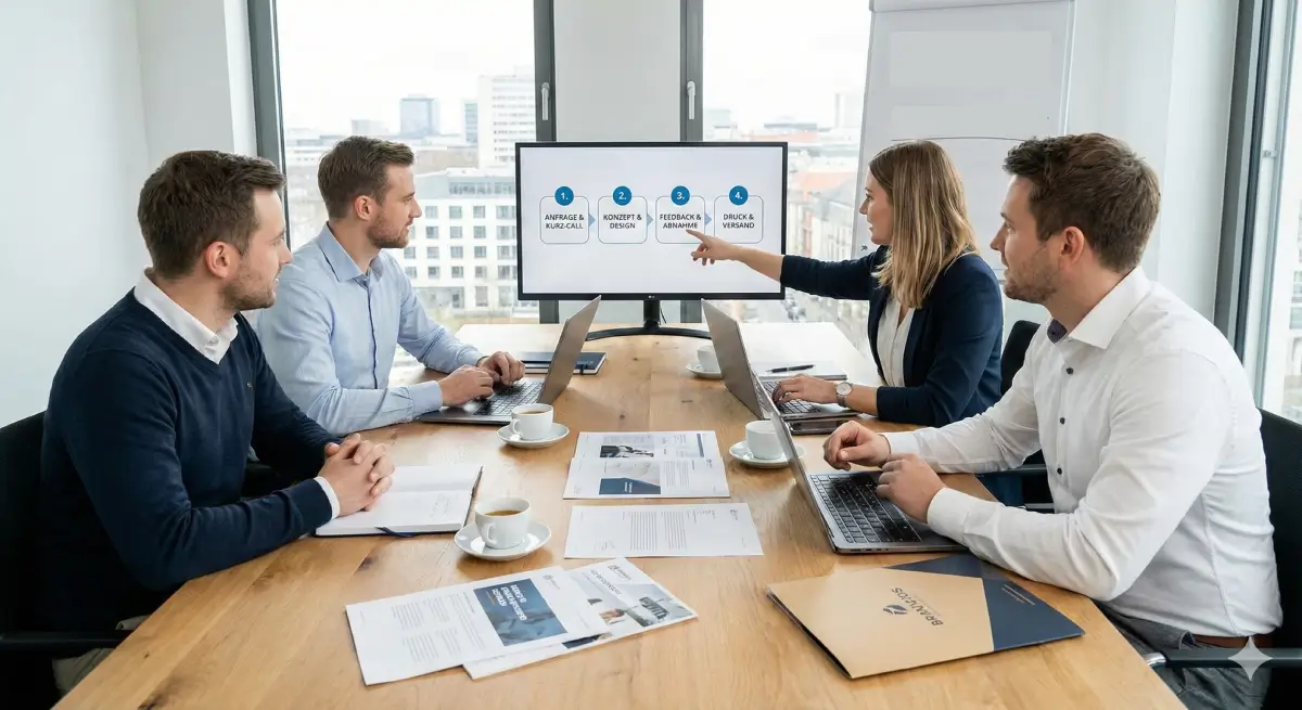 Sie stellen eine Anfrage. Wir klären Zielgruppe, Angebot, Positionierung und Einsatzzweck (Print, PDF oder beides).